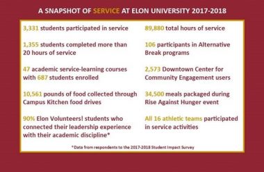 Those are just a few of the details from Elon’s annual “snapshot of service” that offers a look at the broad range of opportunities Elon students participate in as part of the university’s focus on making service a part of the Elon experience.