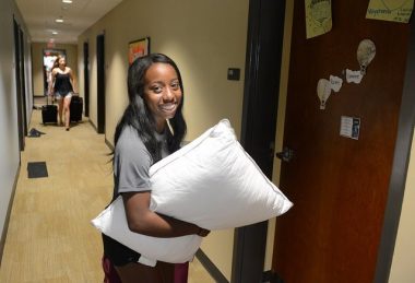 At Move-In, students have staggered move-in times depending upon which floor they will live on, with the top floors in each neighborhood starting first at 8 a.m., with the next phases beginning at 9:30 a.m. and then 10:30 a.m. Students and families can find their proper move-in start times here.
