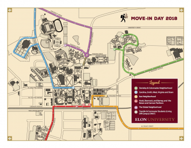 Staggered move-in times helps handle the high volume of students and their families who will be coming to Elon’s campus during move-in day and help reduce congestions, particularly on roads and parking lots around campus, as well as in the residence hall hallways and stairwells.