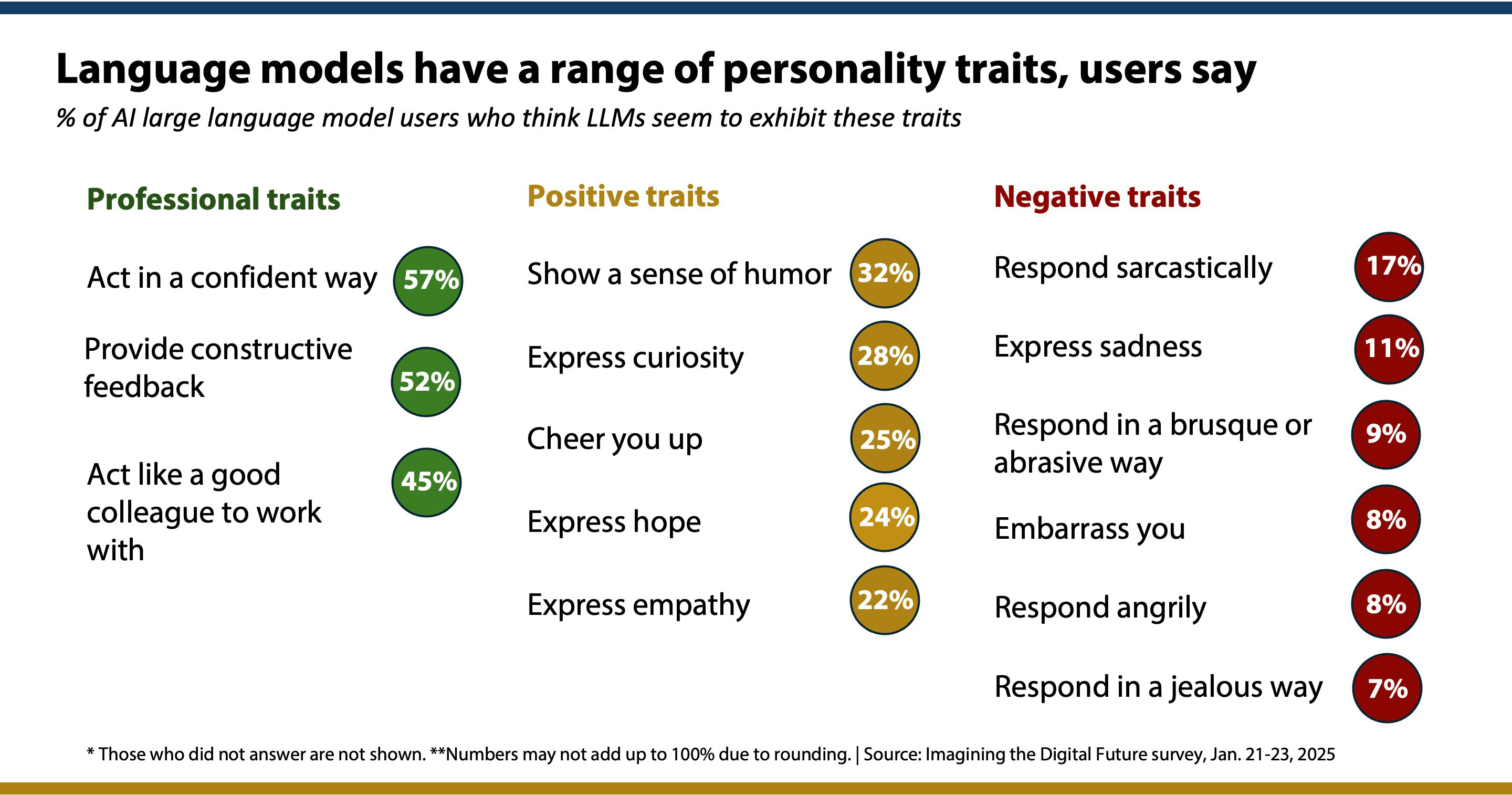 The other major trend captured in the survey is the extent to which these LLM users say they have human-like encounters with these tools and the sense of some users that the models have personality traits that are both pleasing and dismaying. For instance, among LLM users: