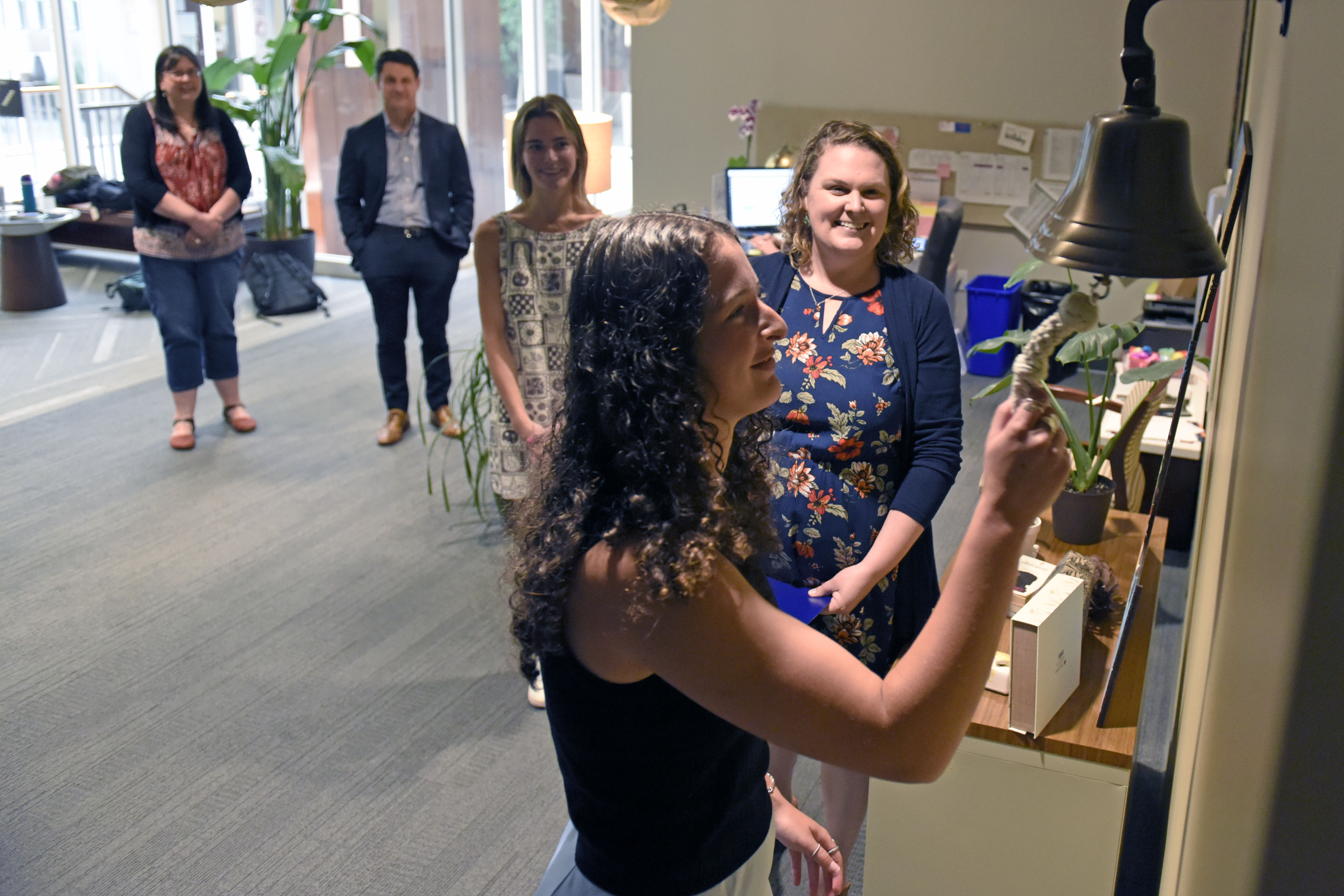 A pair of rising seniors were the first to ring a bell gifted to Elon University this spring by the Peace Corps to commemorate a popular campus program completed by dozens of students over the past decade.