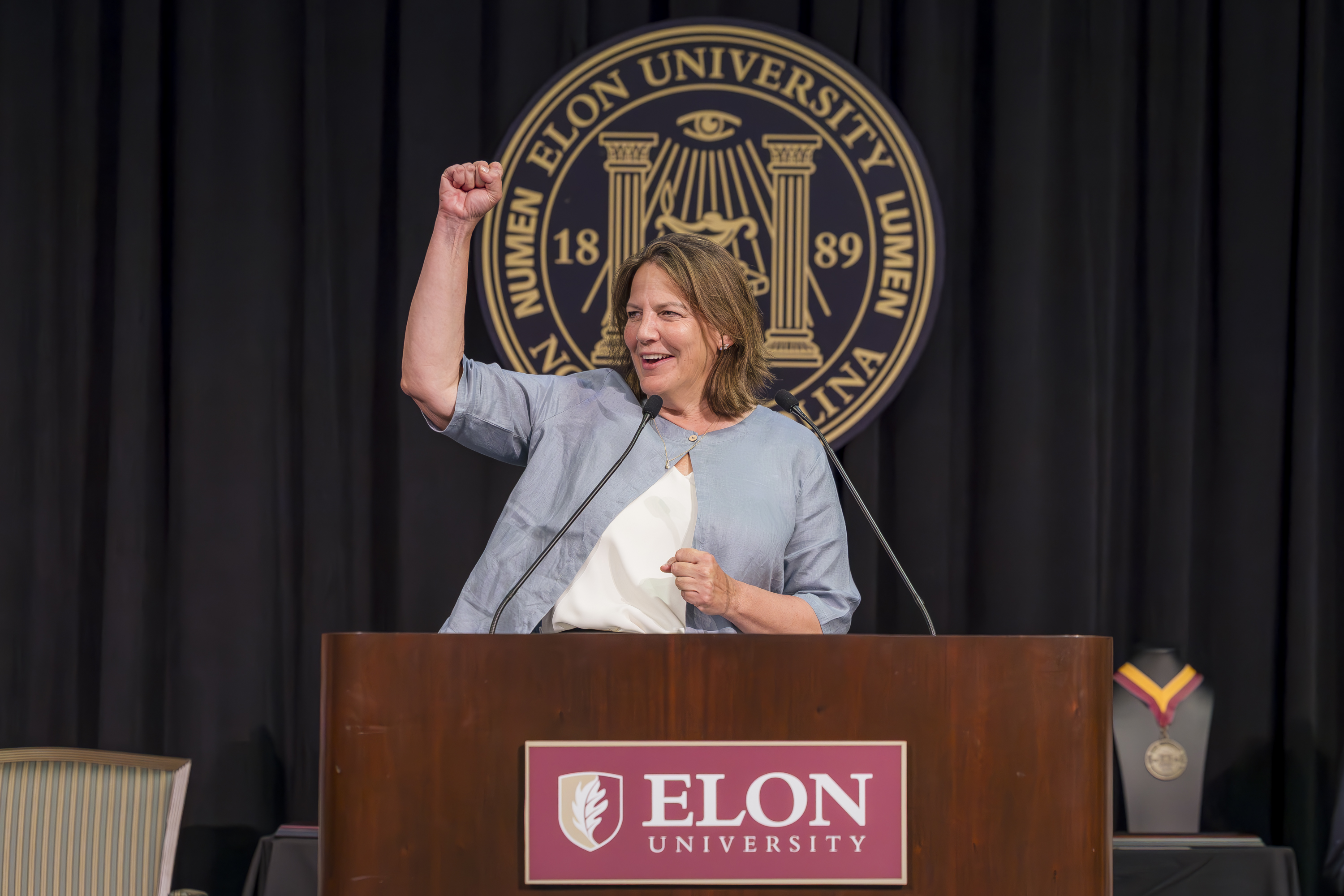 President Connie Ledoux Book welcomed faculty and staff to Alumni Gym, expressing excitement for the year ahead and the arrival of the Class of 2029. Book emphasized Elon’s commitment to transformational learning and acknowledged reaching the midpoint of the Boldly Elon Strategic Plan for 2030.