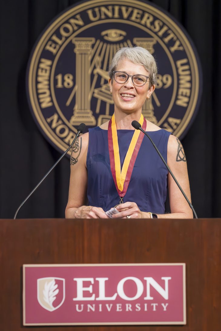 Cassandra DiRienzo, professor and department chair of economics, was honored as the Sheldon and Christine Gordon Endowed Professor in Entrepreneurship. A faculty member at Elon since 2002, DiRienzo has led curriculum redesigns, mentored over 50 advisees and published research that bridges economics with social justice. Her work on human trafficking awareness has influenced Elon’s business curriculum and garnered international recognition.