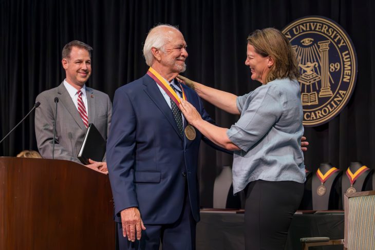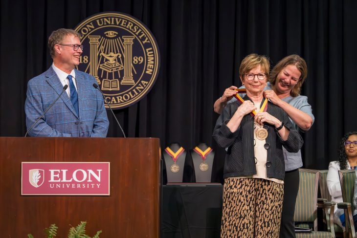 President Connie Ledoux Book presented the medallions on to Rebecca “Becky” Olive-Taylor, retired executive director of the Koenigsberger Learning Center, and retired Vice President G. Smith Jackson as part of a ceremony that formally opened the new academic year at Elon University.