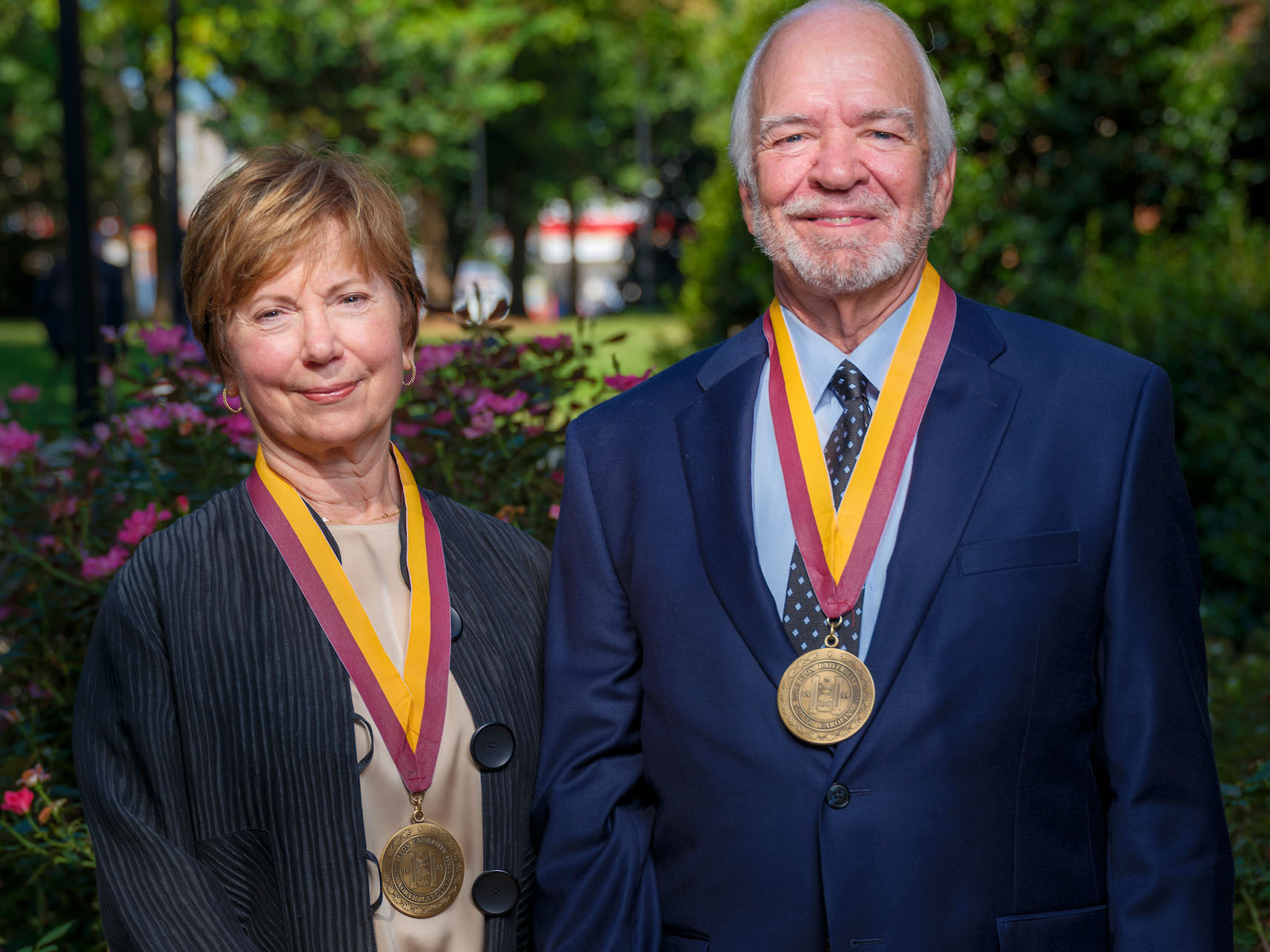 President Connie Ledoux Book presented the medallions on to Rebecca “Becky” Olive-Taylor, retired executive director of the Koenigsberger Learning Center, and retired Vice President G. Smith Jackson as part of a ceremony that formally opened the new academic year at Elon University.