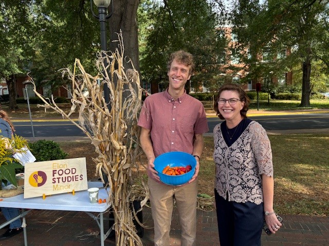 The table featured autumn-themed decorations, a basket of brightly colored peppers and a handmade wooden sign created at Elon’s Maker Hub, highlighting the creative spirit behind the program. Professor Jacob Rutz invited attendees to try “Pepper Roulette,” an activity where participants guessed which pepper was sweet and which was spicy. Sampling peppers gave students and faculty the chance to learn about their flavors, heat levels and role in food traditions.