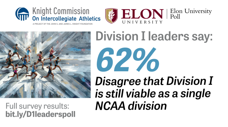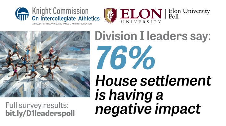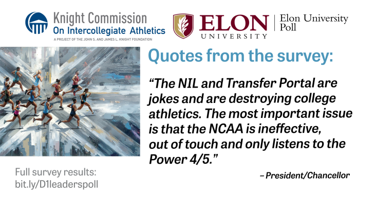 This survey was developed by the Knight Commission on Intercollegiate Athletics and the Elon University Poll. It was fielded by the Elon University Poll as a Qualtrics, web-based, self-administered survey between July 29 and August 22, 2025. Those invited via email to take the survey included representatives at 364 NCAA Division I colleges and universities. There were 376 respondents, including 61 presidents or chancellors, 94 athletics directors, 79 senior woman administrators and 142 faculty athletics representatives. The respondents included 51 individuals from Football Bowl Subdivision (FBS) Power 4/autonomy conferences, 83 from the FBS Group of Six conferences and FBS Independents, 128 from the Football Championship Subdivision and 114 from Division I basketball centric (no football) schools. The overall margin of error for this poll is +/-4.4%, with larger margins of error for subgroups. Access the full report, charts, survey topline and methodology at: bit.ly/D1leaderspoll.