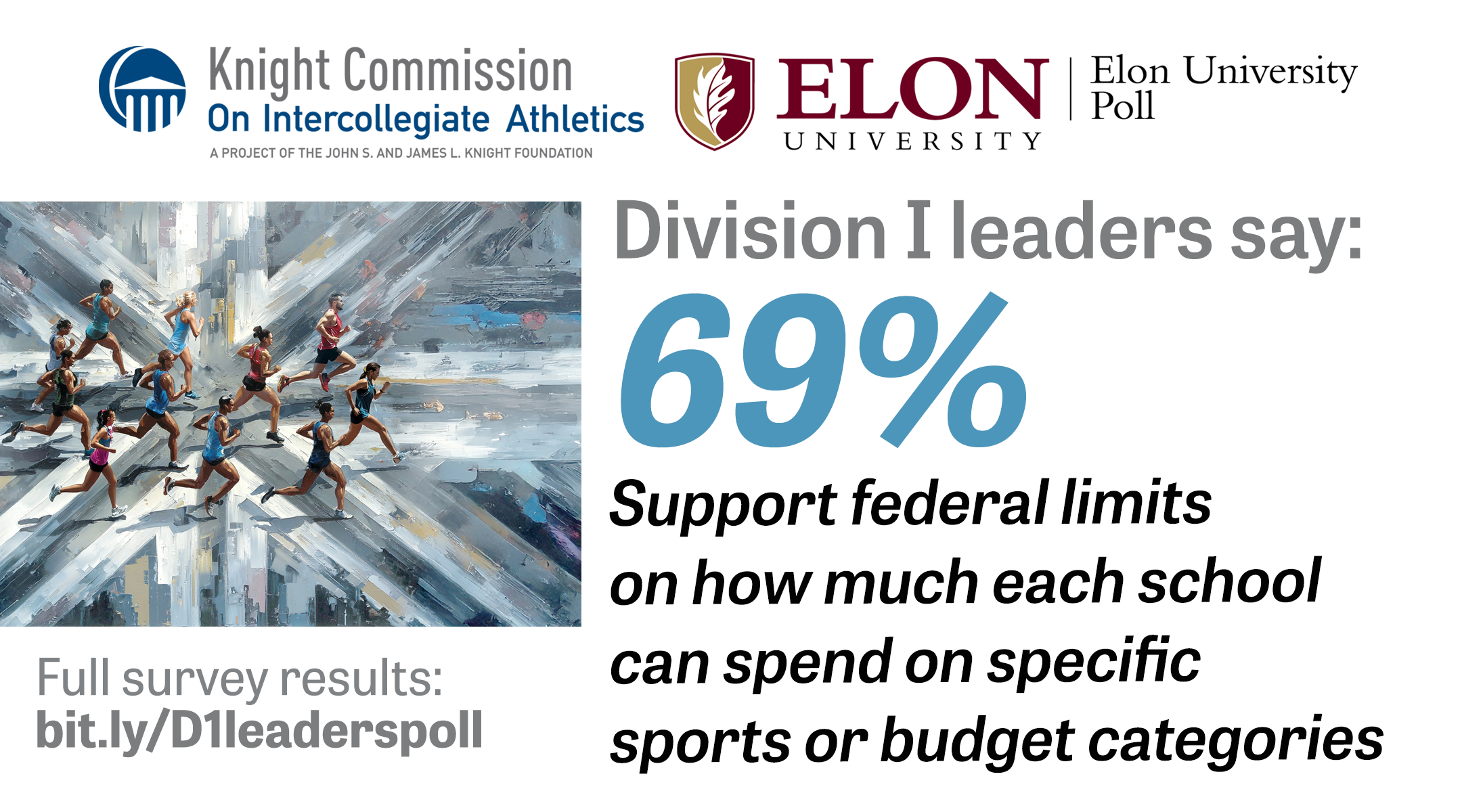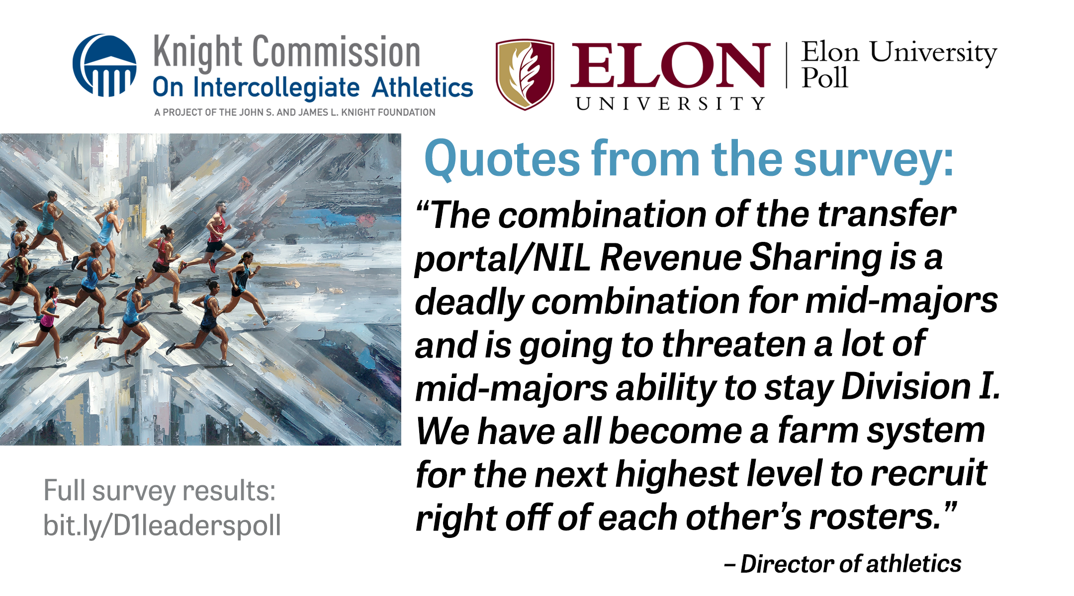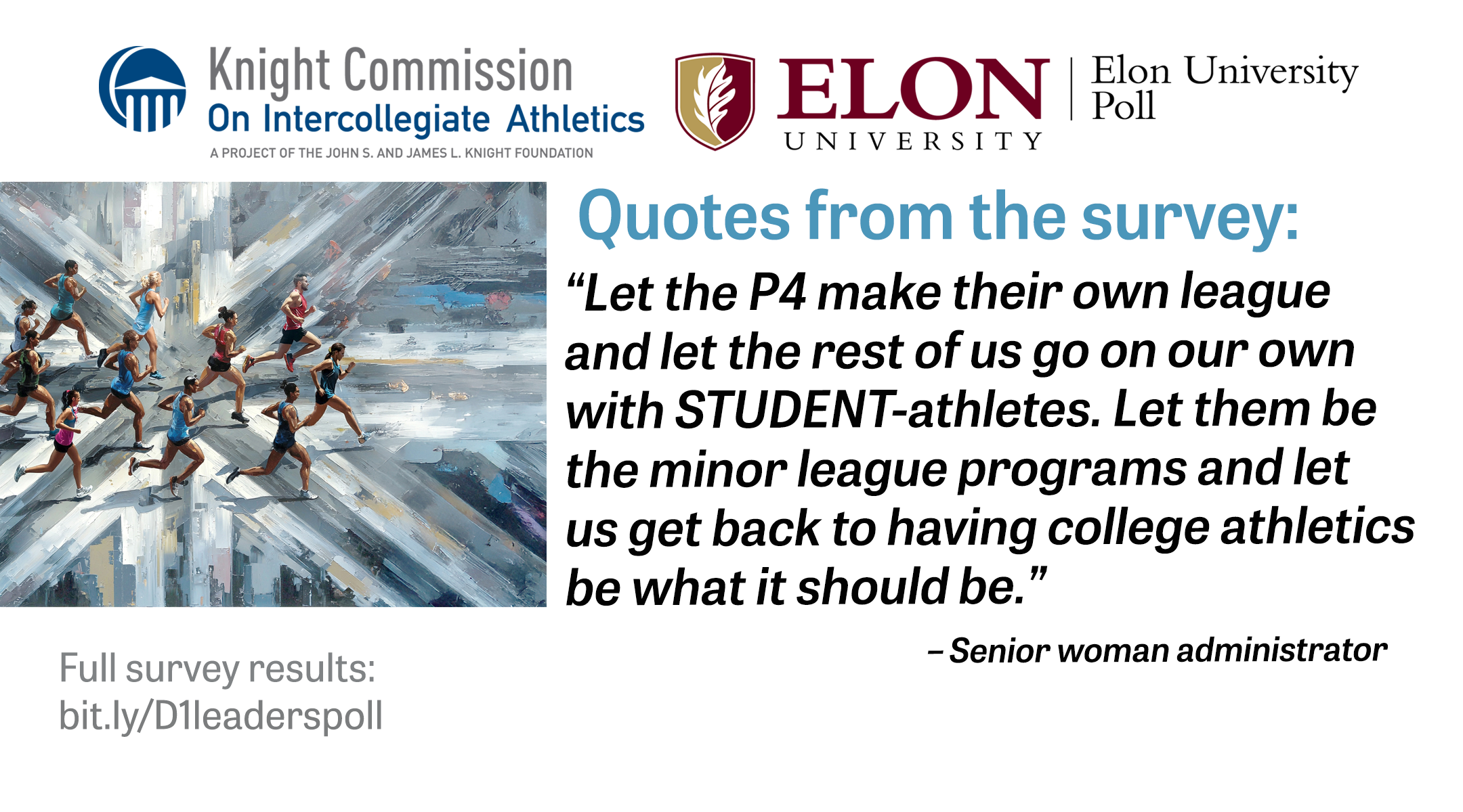 This survey was developed by the Knight Commission on Intercollegiate Athletics and the Elon University Poll. It was fielded by the Elon University Poll as a Qualtrics, web-based, self-administered survey between July 29 and August 22, 2025. Those invited via email to take the survey included representatives at 364 NCAA Division I colleges and universities. There were 376 respondents, including 61 presidents or chancellors, 94 athletics directors, 79 senior woman administrators and 142 faculty athletics representatives. The respondents included 51 individuals from Football Bowl Subdivision (FBS) Power 4/autonomy conferences, 83 from the FBS Group of Six conferences and FBS Independents, 128 from the Football Championship Subdivision and 114 from Division I basketball centric (no football) schools. The overall margin of error for this poll is +/-4.4%, with larger margins of error for subgroups. Access the full report, charts, survey topline and methodology at: bit.ly/D1leaderspoll.