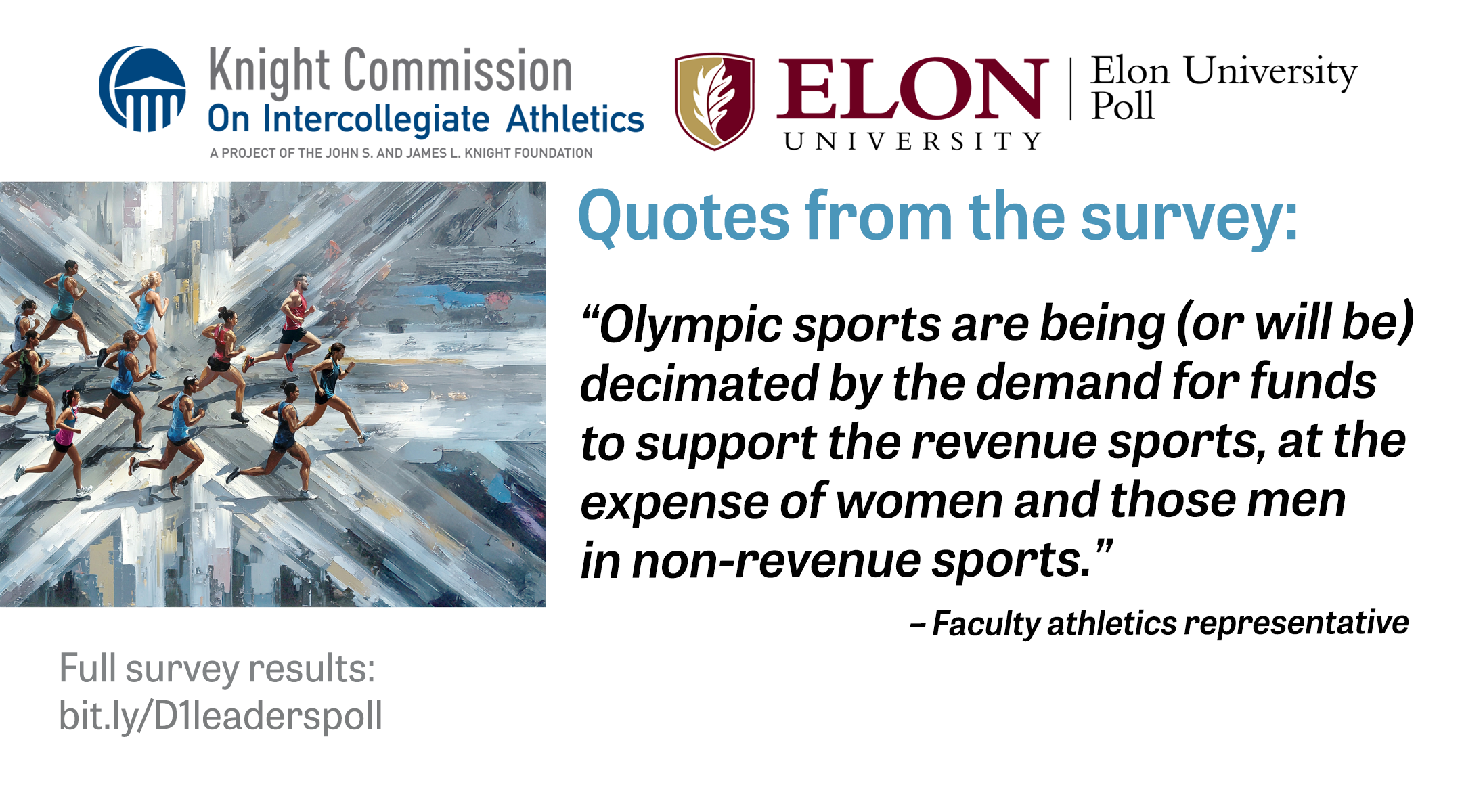 “This survey presents a clear picture of a defining moment for Division I college sports,” said Len Elmore, Knight Commission co-chair. “Navigating the path forward will require difficult decisions about finances, governance and the core identity of college athletics.”
