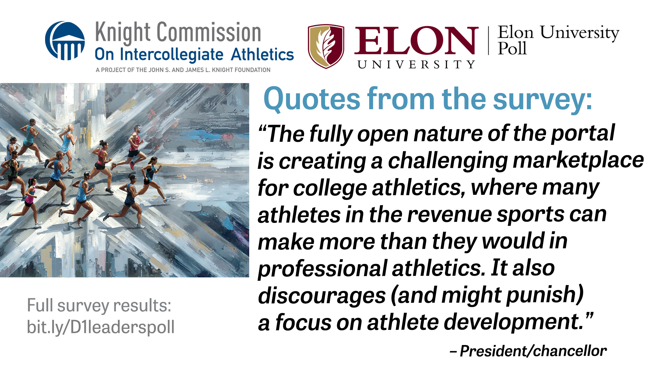 The Elon Poll/Knight Commission survey found that campus leaders are deeply concerned about the financial sustainability of their athletics programs, current college athlete transfer rules and unprecedented changes they fear will harm women’s and collegiate Olympic sports. At the same time, they expressed a near-unanimous and unwavering commitment to the academic mission of college sports, with resounding support for maintaining academic standards and prioritizing graduation.