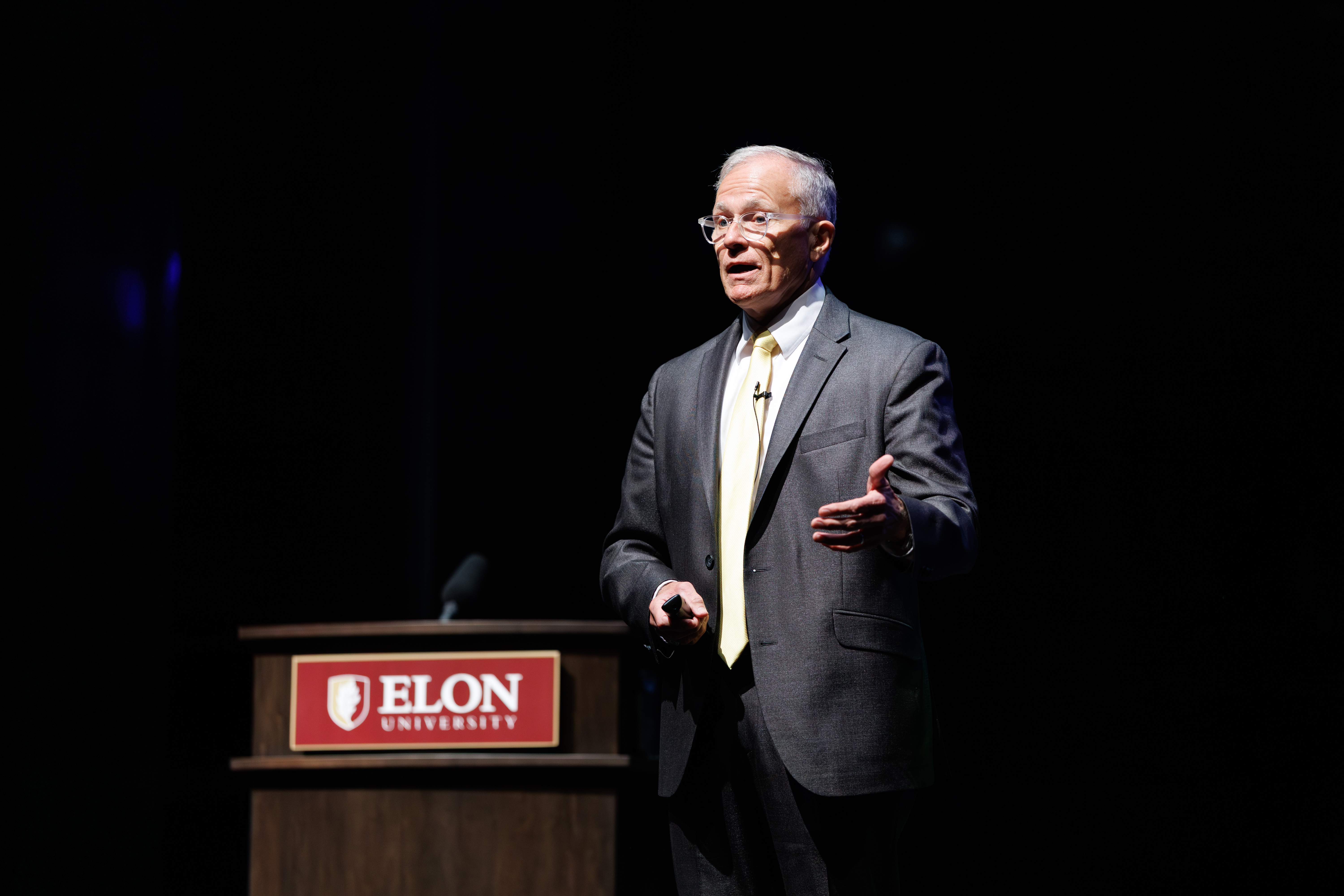 Retired Lt. Gen. Robert P. Ashley, Jr. urged Elon students, faculty, staff and visitors to pair gratitude for military service with clear-eyed engagement in a rapidly changing world during the Carol Ann Walker International Lectureship on Nov. 11, held in McCrary Theatre as part of the university’s Veterans Day observance.