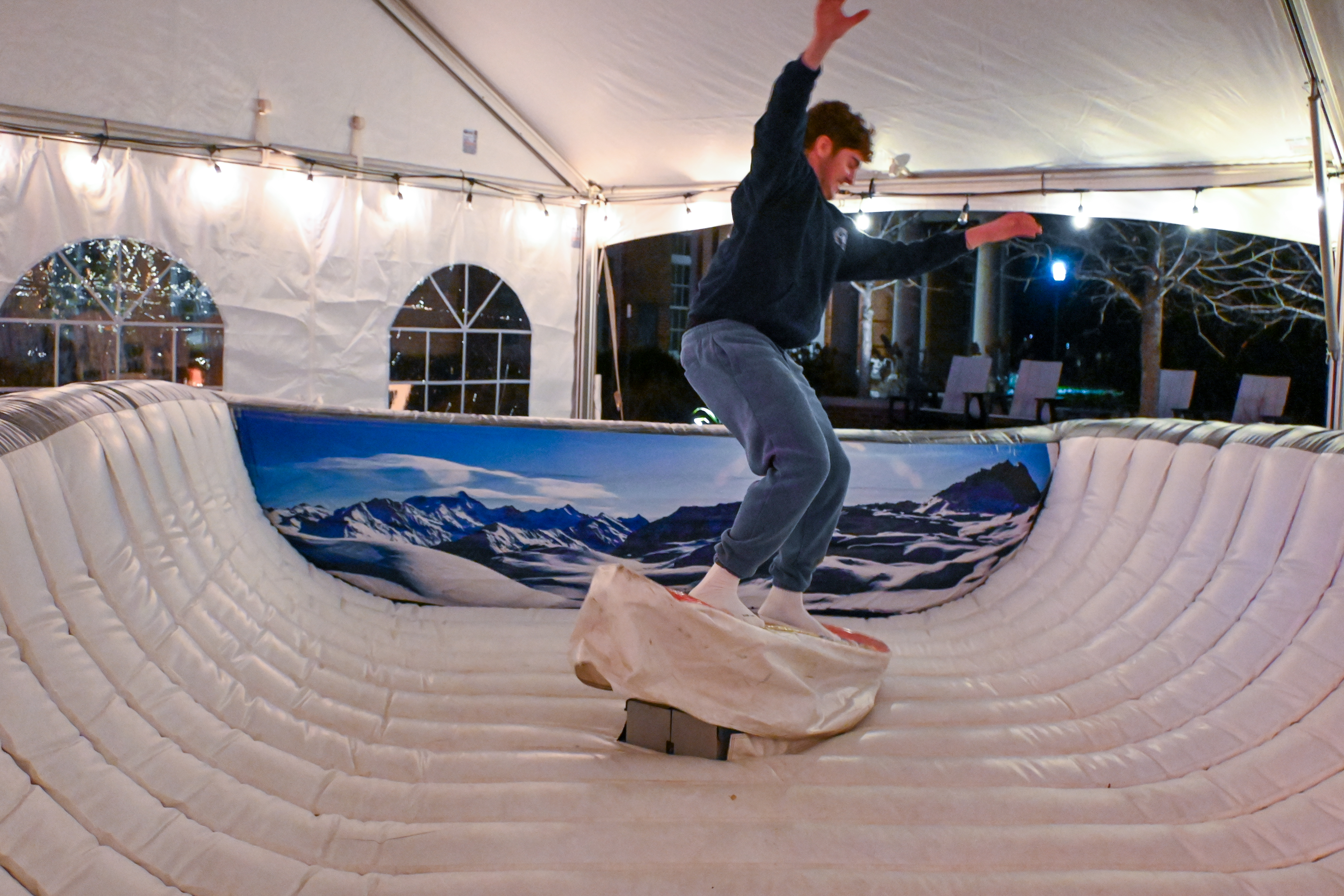 Students celebrated the holidays with Elon University President Connie Ledoux Book during the annual Student Holiday Party, which featured a surfing simulator, at The Inn at Elon.