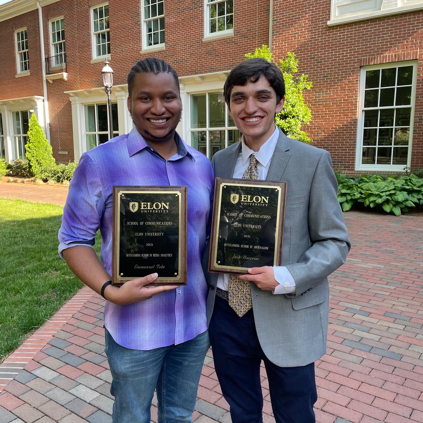 Emmanuel Tobe ’21 (right) with his award for Outstanding Senior in Analytics for 2021; Jack Norcross ’21 (left) with his award for Outstanding Senior in Journalism for 2021