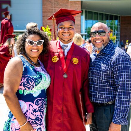 Emmanuel Tobe ’21 with his parents at Elon graduation