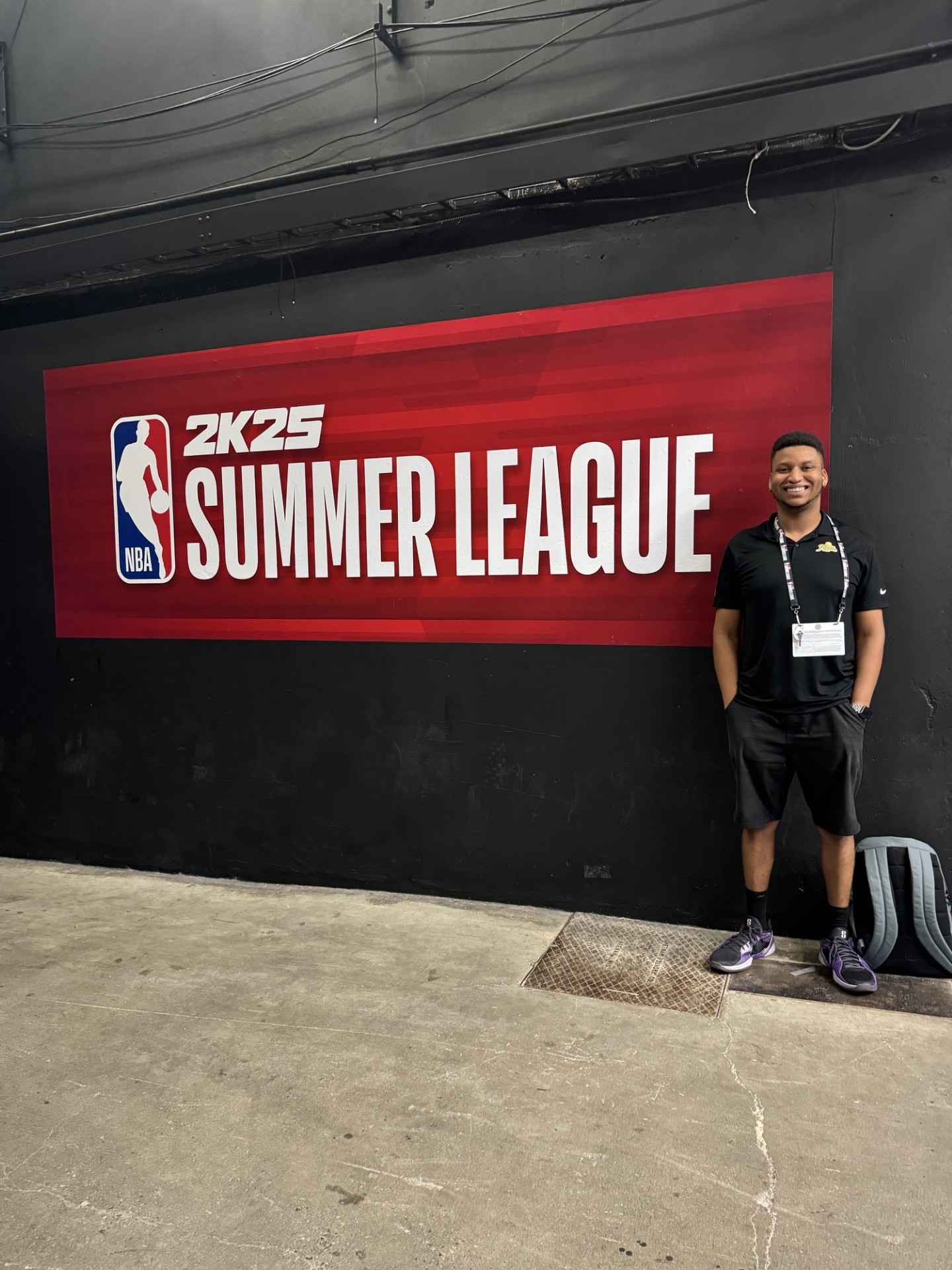Emmanuel Tobe ’21 poses in front of the NBA Summer League Flag in LA