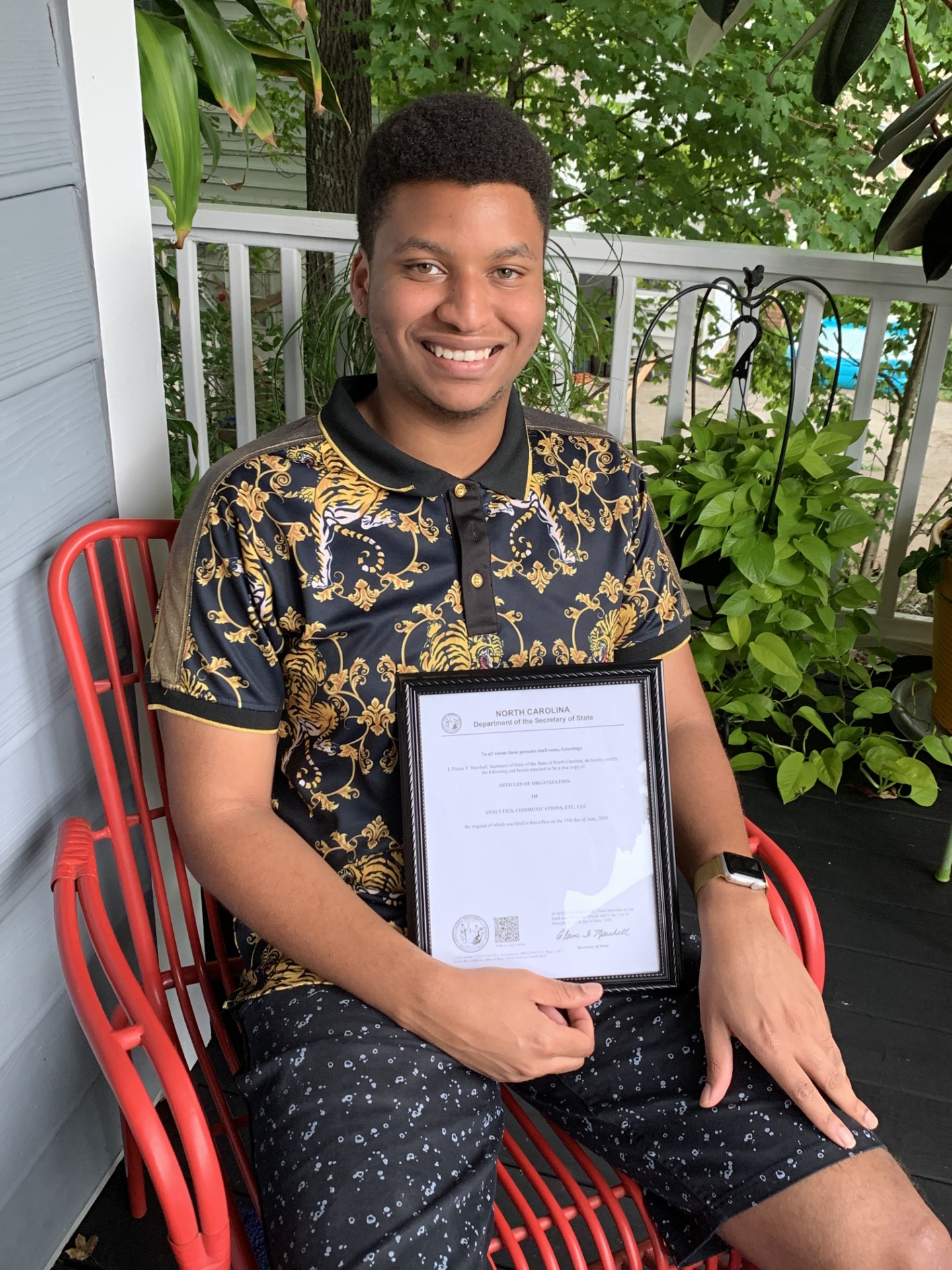 Emmanuel Tobe ’21 poses with his certificate for his new company.