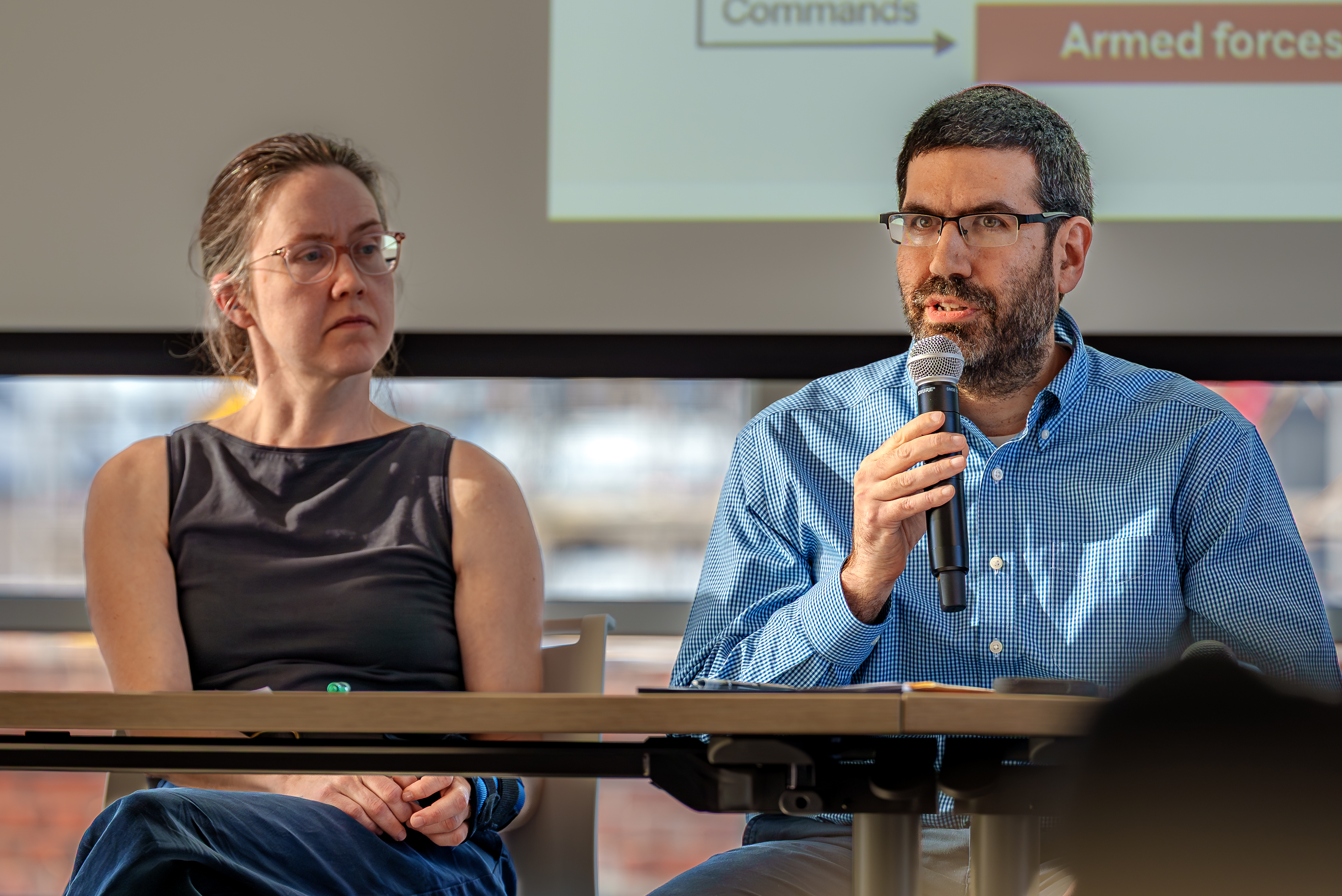 Baris Kesgin, associate professor of political science and public policy, explained the Iranian political system in which religious authority and democratic practices play a part in governing society. Using graphs that outlined the political hierarchy, Kesgin emphasized the seriousness of the death of Iran’s Supreme Leader, Ayatollah Ali Khamenei, and how Iran selected their new Supreme Leader, Mojtaba Khamenei.