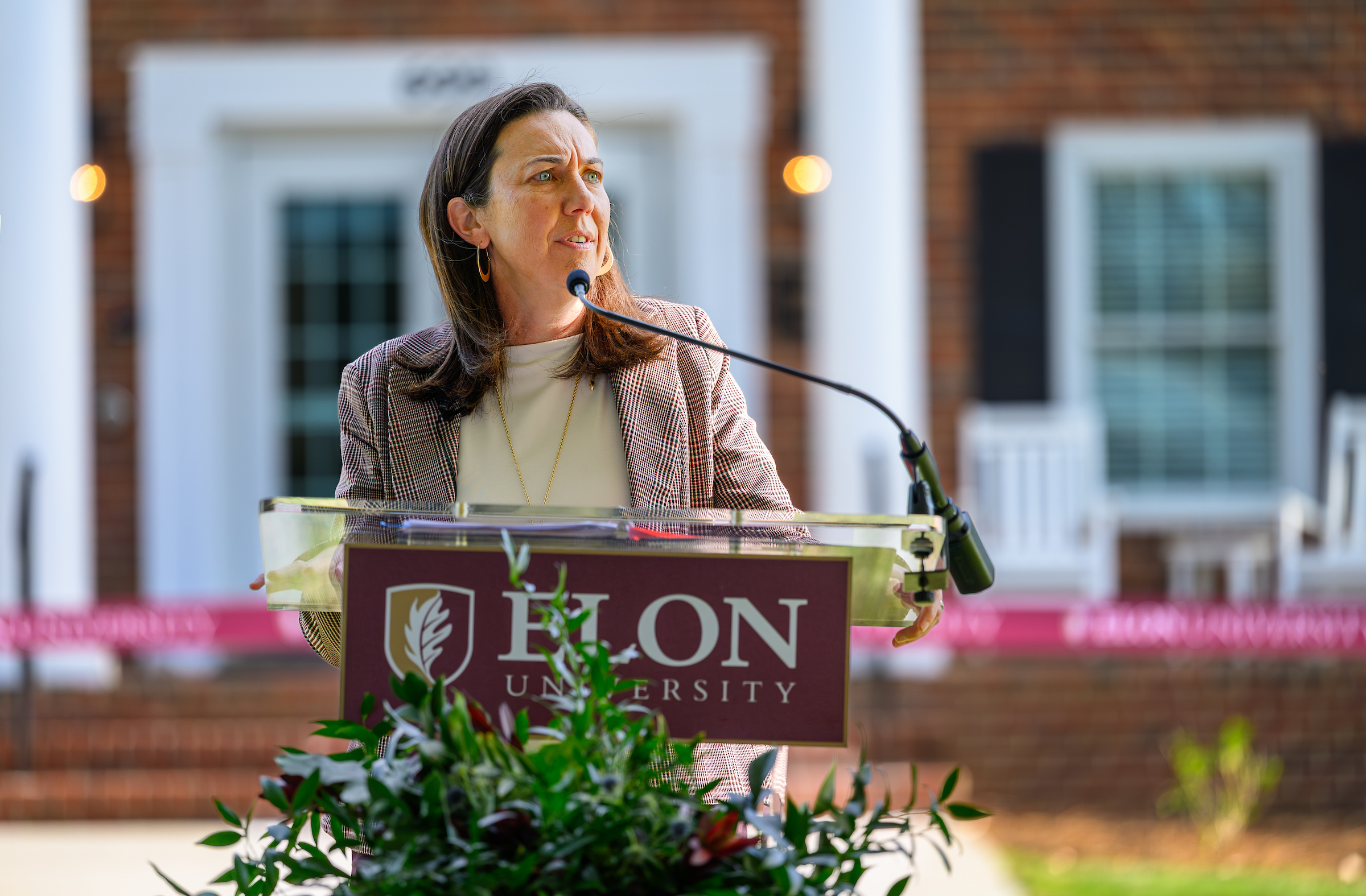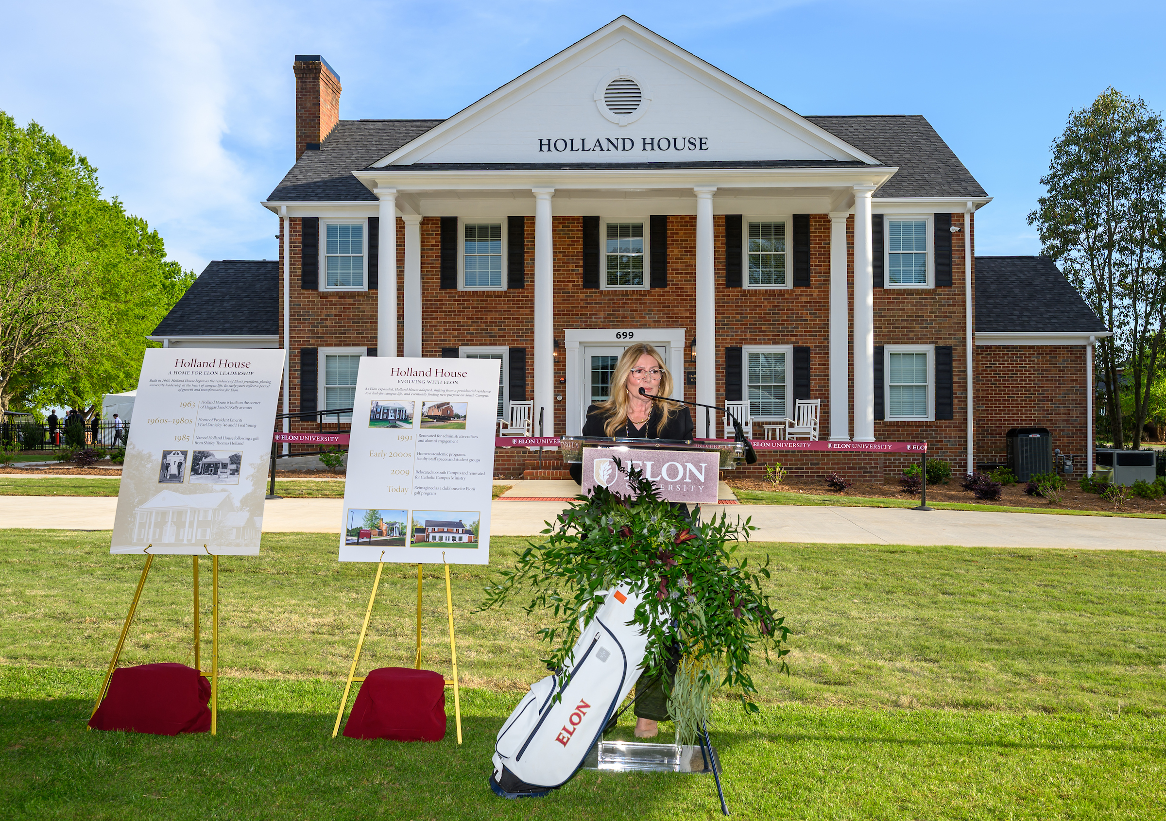 Jennings Glenn ‘25 G’26, a member of the men’s golf team, and Elon Trustee Debra Del Vecchio P’22 P’24 also delivered remarks during the ceremony, which was held on the front lawn of Holland House.