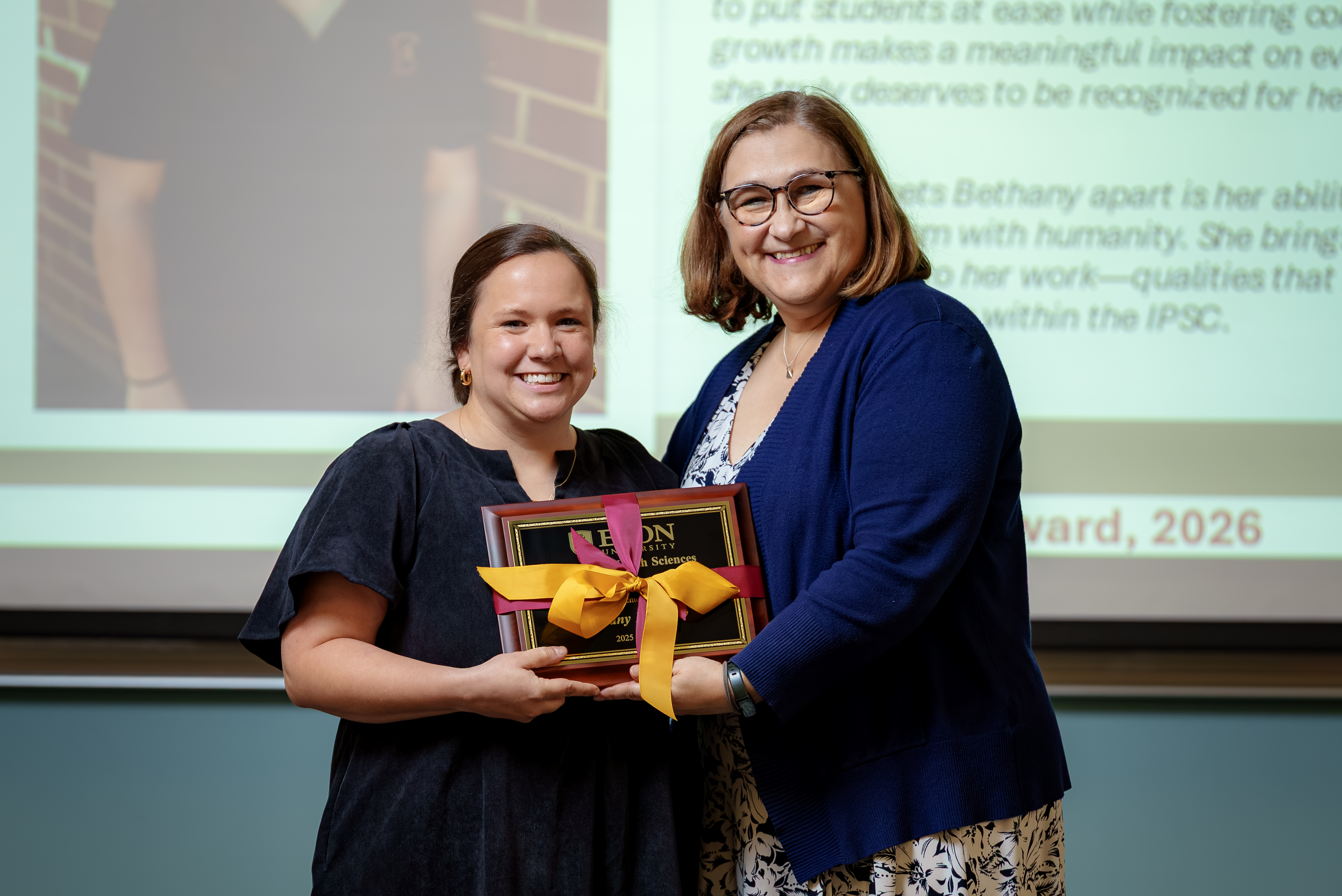 This award is designed to recognize a full time School of Health Sciences community member who has served through service, leadership and/or collaboration. The award was presented by Bethany Fearnow, stimulation coordinator for the Interprofessional Stimulation Center.
