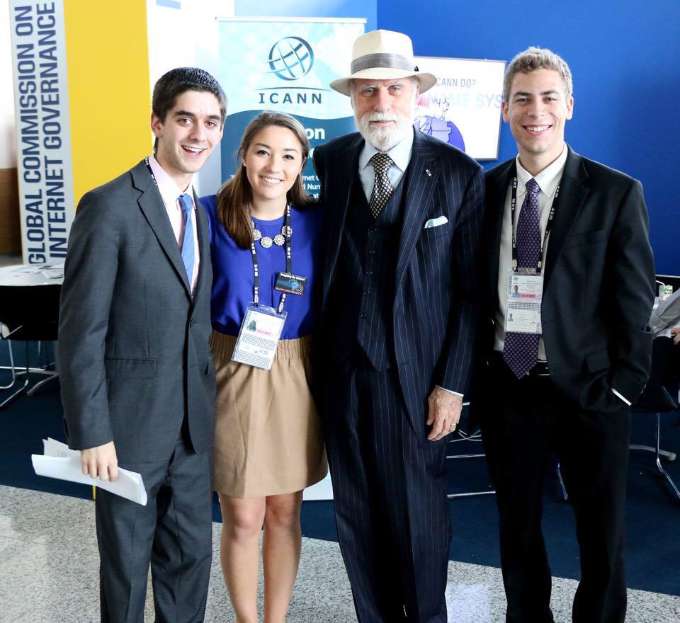 (L-R) Gary Grumbach ’16, Jackie Pascale ’18, Google “Chief Internet Evangelist” Vint Cerf, and Jacob LaPlante ’17, in João Pessoa, Brazil, with the Imagining the Digital Future Center.