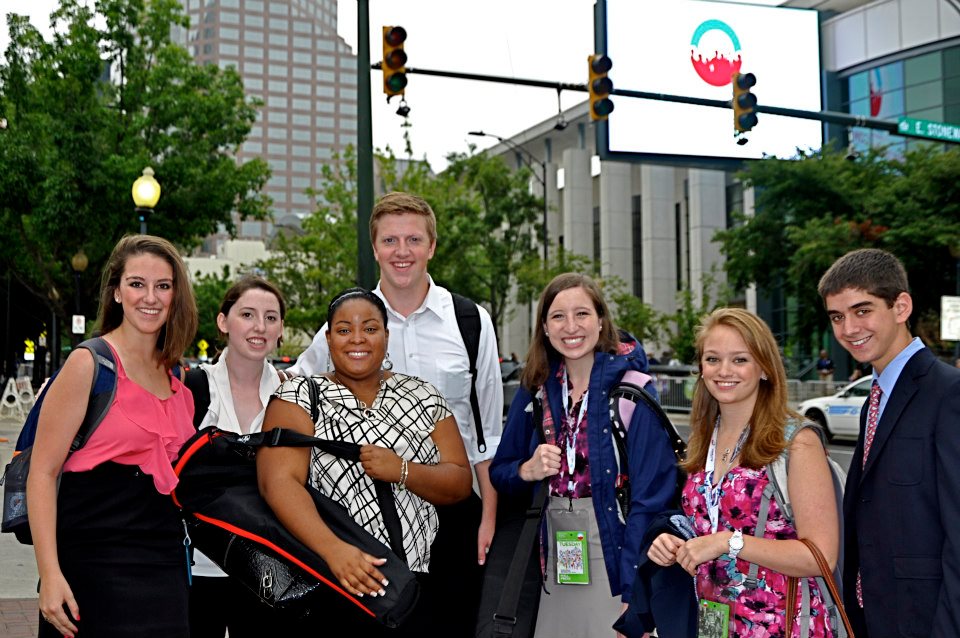 Elon Local News Covering the Democratic National Convention in Charlotte, (L-R) Allison D’Amora ’13, Kelly Finneran ’15, Arnetia Fogg ’14, Jason Puckett ’13, Nicole Chadwick ’14, Julie Morse ’13 and Gary Grumbach ’16.