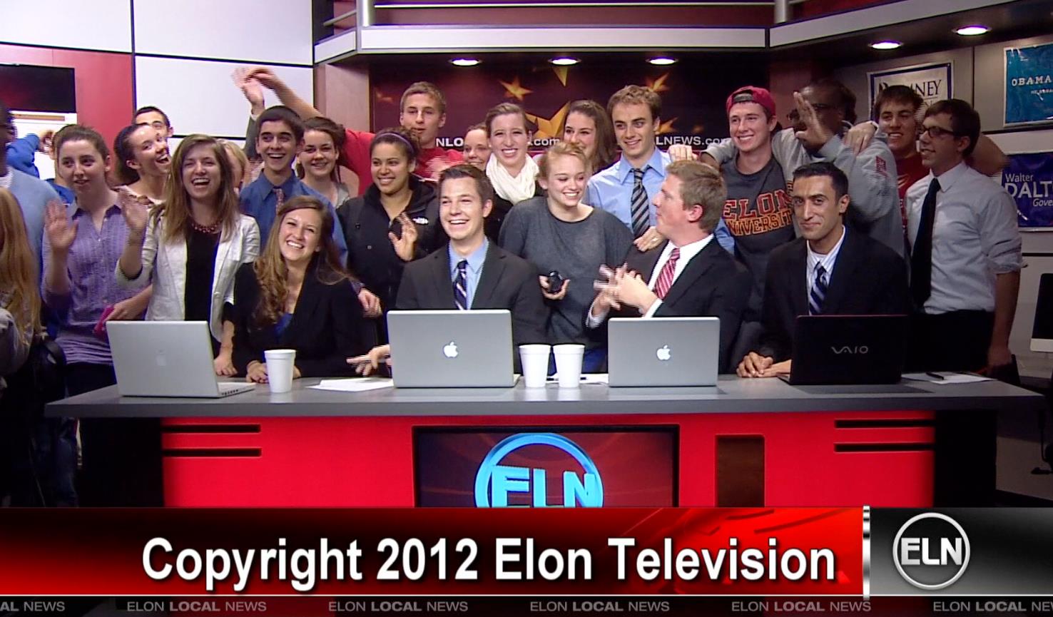 Gary Grumbach ’16 (third row, second from left) and fellow Elon Local News students at 3:00 a.m. after wrapping a marathon live election night broadcast.