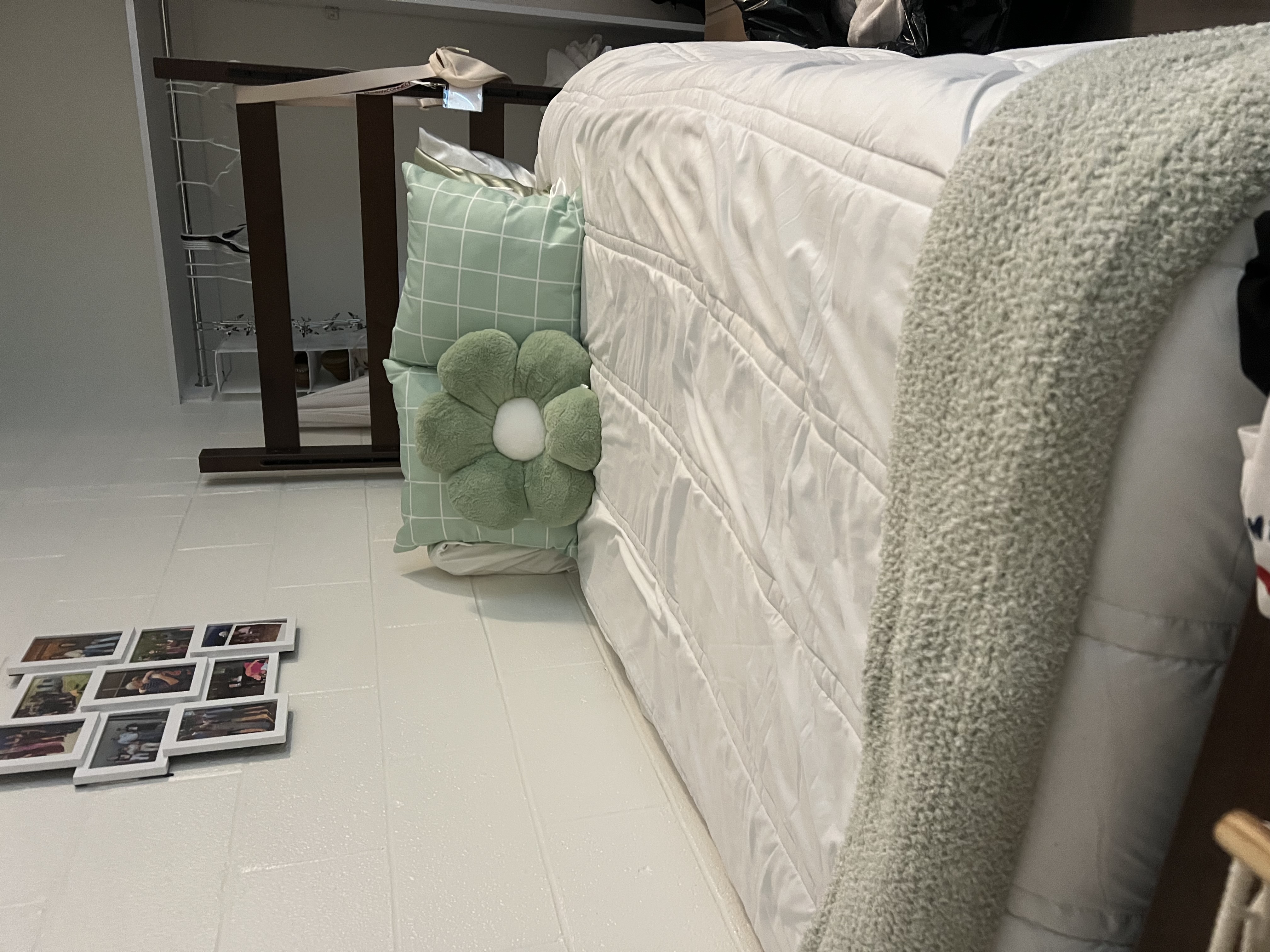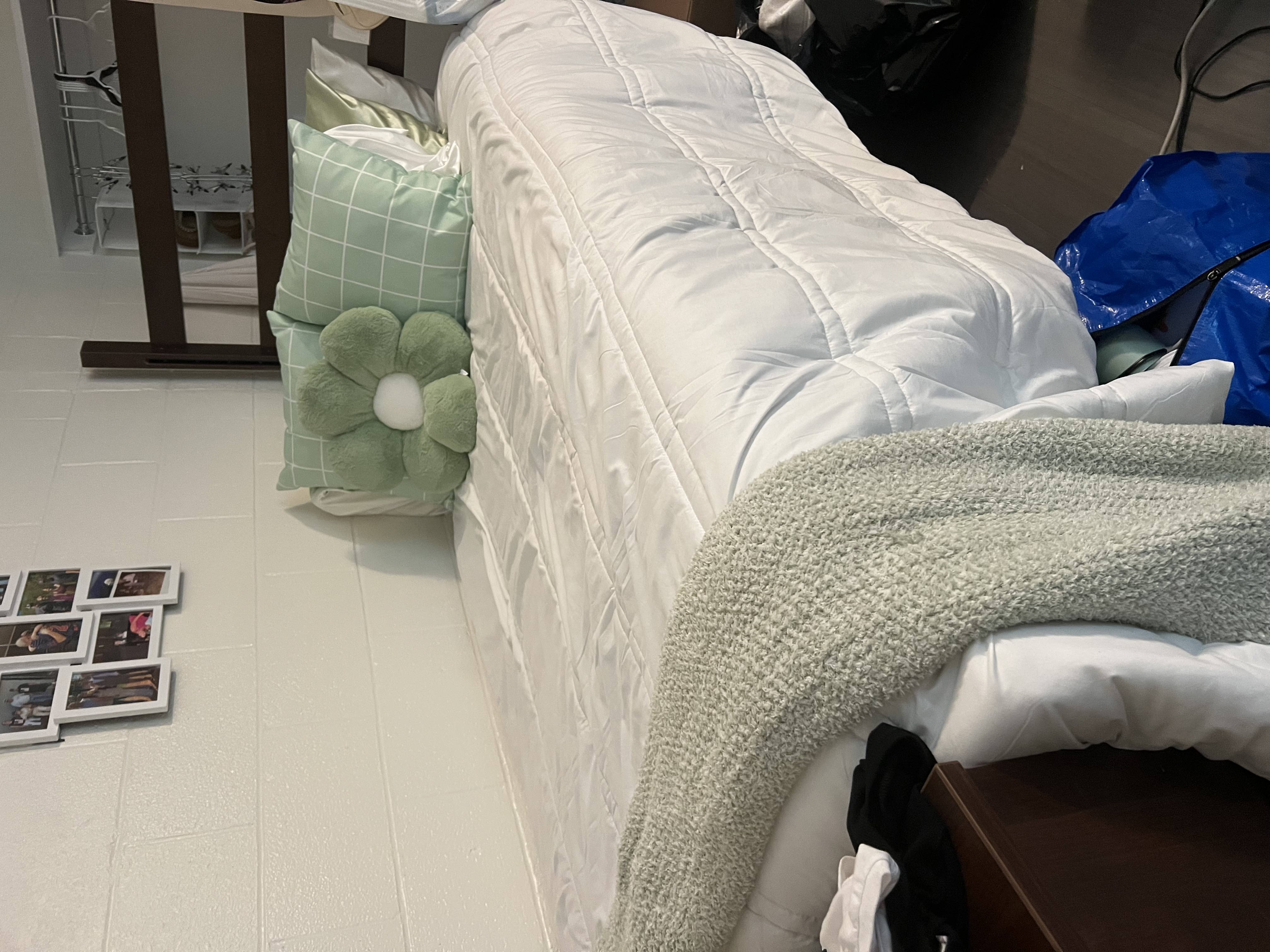Only used for one year. White comforter twin xl and satin sheets. Green throw pillow also.