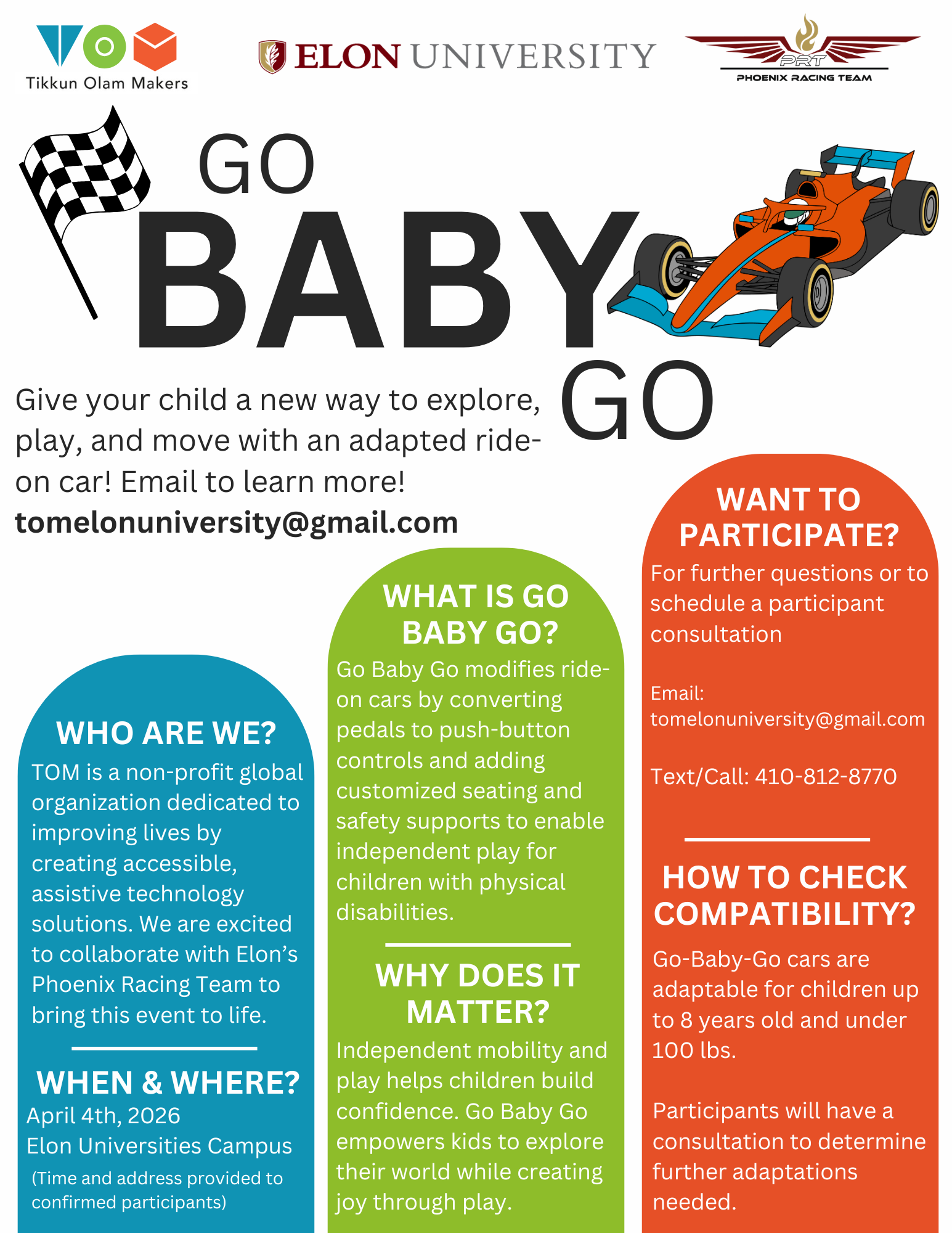 Go Baby Go unites Elon physical therapy students, engineering students and the Phoenix racing team in a collaborative effort to expand access to early mobility for children with disabilities, beginning with the evaluations and volunteer recruitment. Go Baby Go is a national initiative that modifies ride-on toy cars to meet the individual physical needs of young children who experience mobility challenges.