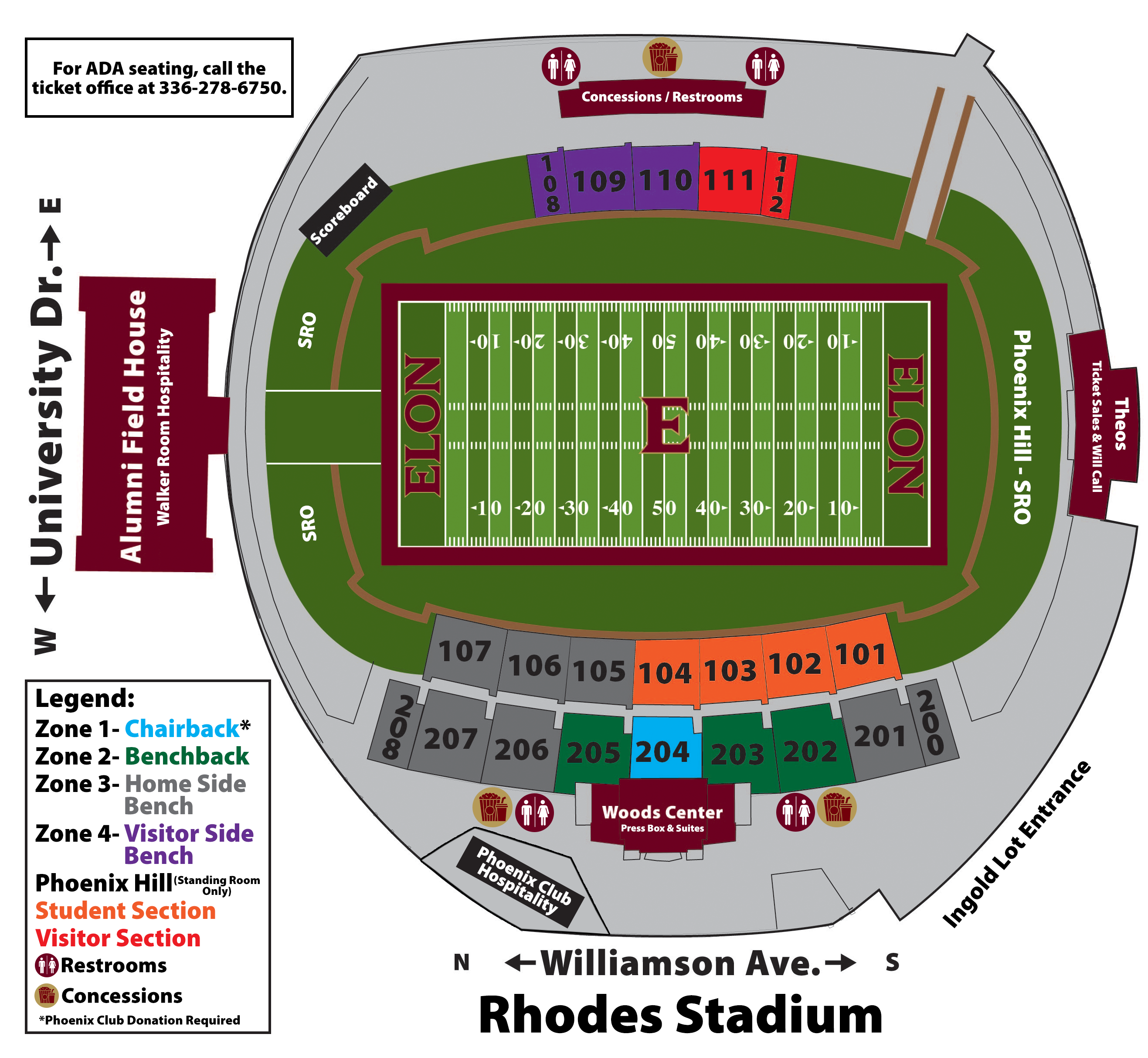 The package includes one parking pass, two priority tickets with seat backs and membership at the $250 level in the Phoenix Club, Elon Athletics’ philanthropic arm. Membership in the Phoenix Club supports Elon student-athlete scholarships. As many as two additional priority tickets may be added to your order. This package also guarantees you a parking spot in the lots closest to Rhodes Stadium for the Family Weekend football game vs. Hampton, entrance to the game at a priority gate, and admission to our halftime hospitality.