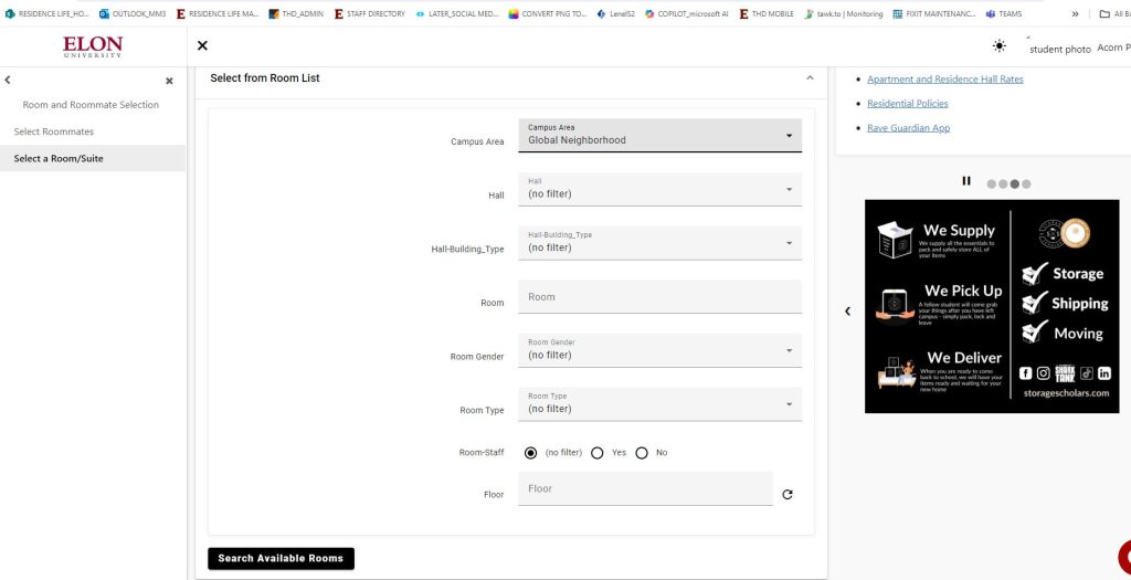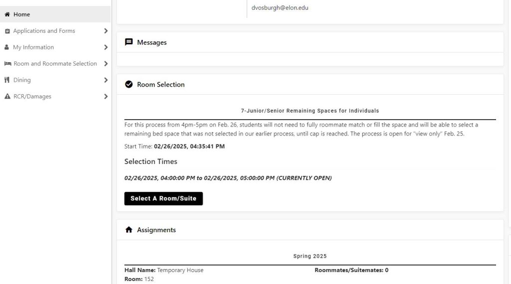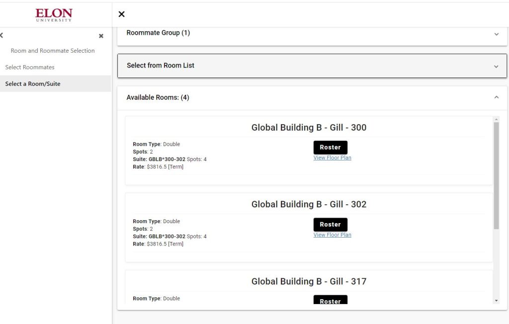 This is the landing page for Room Selection, whereby the user will begin their room search.