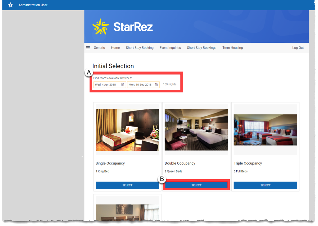 - Room Type: Select from the room types displayed. In this example a double occupancy room has been selected (B)