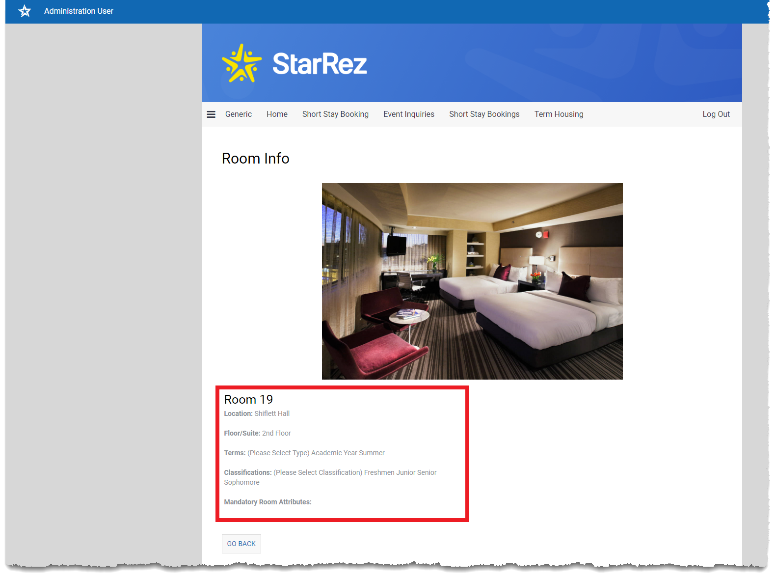 - Show Room Info: Clicking this link will navigate the user to a page whereby they will be able to see all information pertaining to the room (shown below).