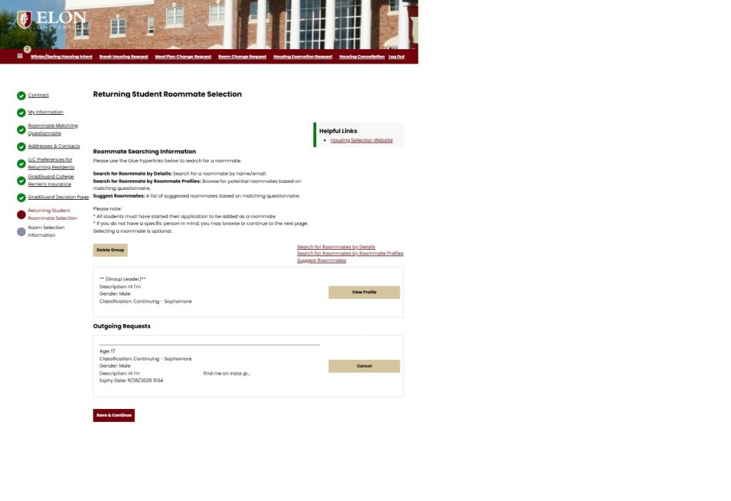 5. Once you have found roommates, the Group Leader will click “Send Roommate Request” to start matching the group together. Each individual must accept the group request in order to join the group.