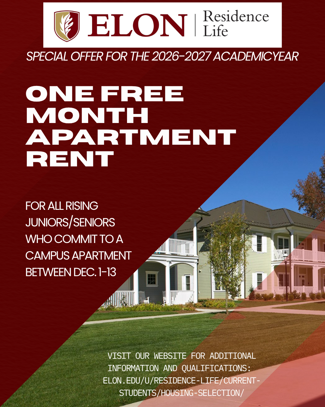 We are pleased to be able to offer one free month rent (applicable to the 2026-2027 rates) for any rising junior or senior who applies for the incentive between December 1-13 and who successfully selects an apartment-style space during junior/senior housing selection in February.