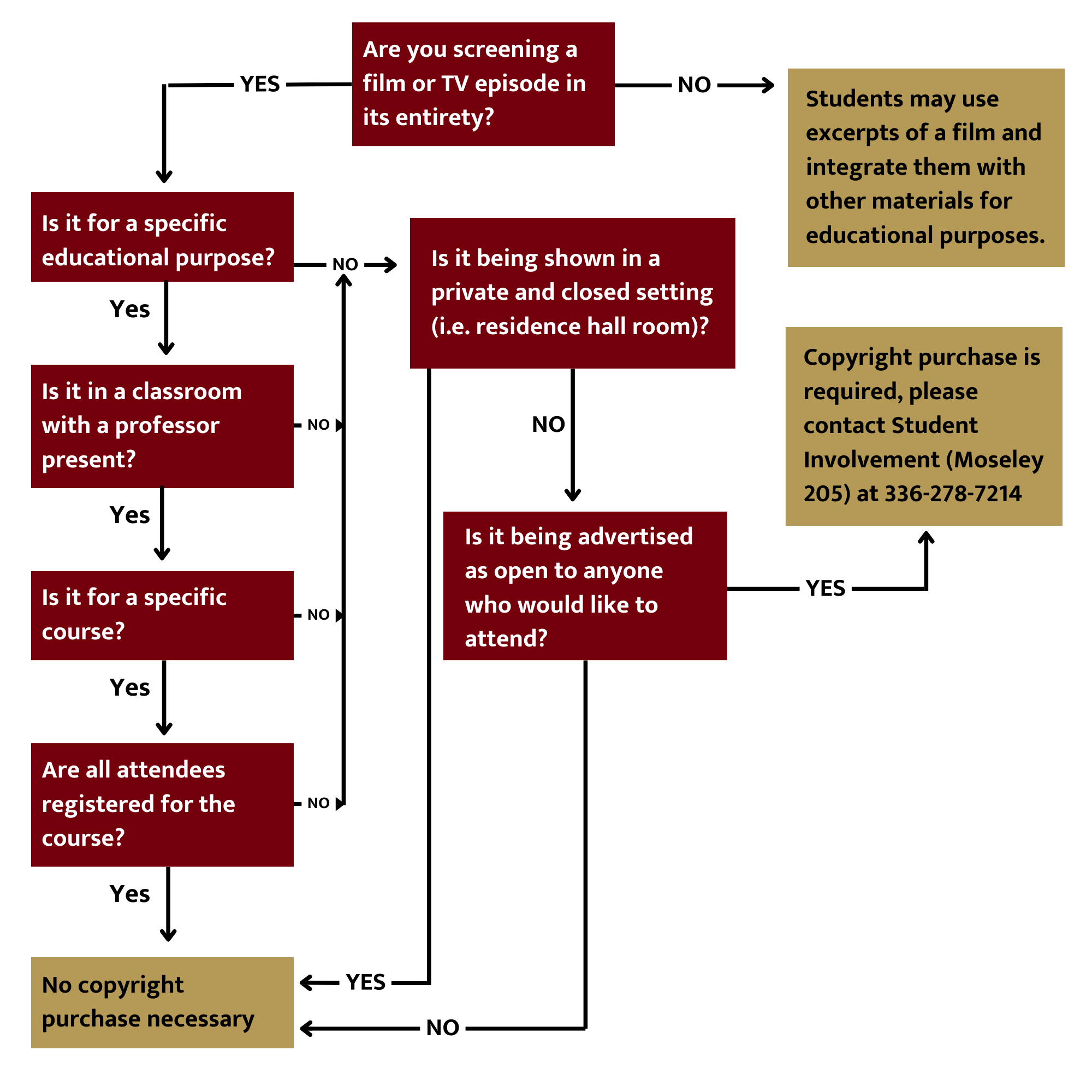 Planning to host a movie night or film screening? Please use the flow chart below to determine if it is necessary to purchase the copyrights and proper licenses to screen the film. Contact Student Involvement with any questions.